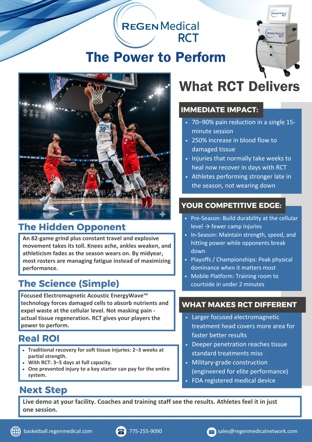 Elite basketball programs are turning to Regenerative Cellular Technology (RCT) for one reason: it keeps players at peak performance – accelerating recovery, fortifying tissue resilience, and minimizing downtime. It's a cutting-edge, non-invasive therapy that uses Focused Electromagnetic Acoustic EnergyWave™ to supercharge the body's own healing so your players spend more time on the court and less time in the training room.
